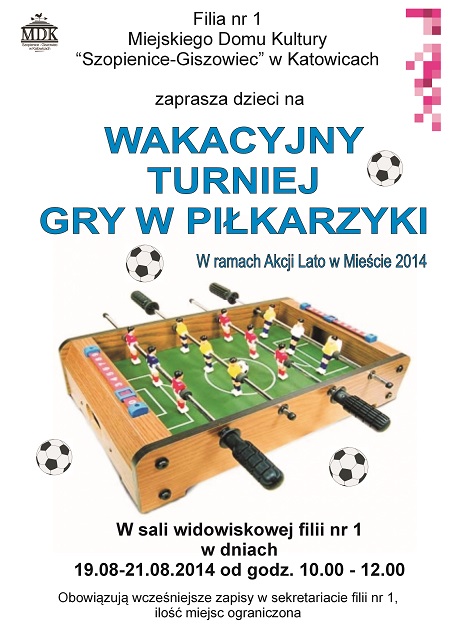 Filia nr 1 Miejskiego Domu Kultury „Szopienice-Giszowiec” w Katowicach przy ul. Obr. Westerplatte 10 zaprasza dzieci na Wakacyjny Turniej Gry w Piłkarzyki, który odbędzie się w Sali widowiskowej w dniach 19-21.08.2014 od godz. 10.00 do 12.00. Obowiązują wcześniejsze zapisy w sekretariacie filii nr 1. Ilość miejsc ograniczona. Zapraszamy !!!