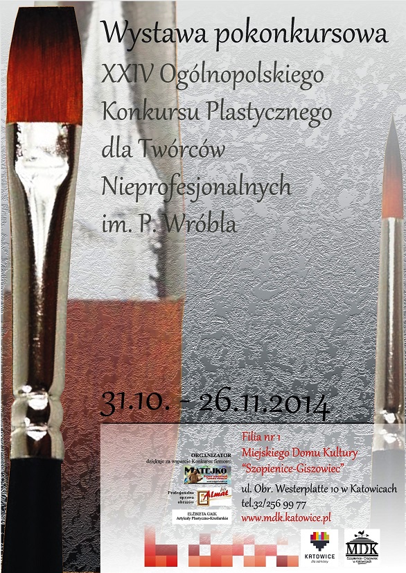 Filia nr 1 Miejskiego Domu Kultury „Szopienice-Giszowiec” ul. Obr. Westerplatte 10 w Katowicach zaprasza na Wieczór Finałowy XXIV Edycji Ogólnopolskiego Konkursu Plastycznego dla Twórców Nieprofesjonalnych im. Pawła Wróbla w Szopienicach. Gala finałowa, wręczenie Nagród Laureatom odbędzie się 31 października o godz. 17.00 Wstęp wolny !!!! ZAPRASZAMY