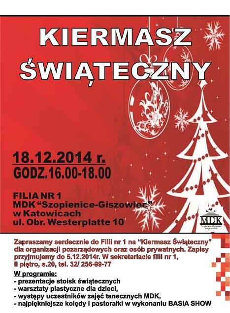 Filia nr 1 MDK w Szopienicach zaprasza na „Kiermasz Świąteczny” z udziałem organizacji pozarządowych lokalnej społeczności dzielnicy Szopienice, który odbędzie się dnia 18.12.2014 r. o godz. 16.00. Wszyscy, którzy będą chcieli zaprezentować swoje prace, wyroby prosimy o zgłoszenie swojego udziału w sekretariacie filii nr 1 MDK „Szopienice – Giszowiec” do 5 grudnia 2014 roku. W programie m.in.: warsztaty plastyczne…