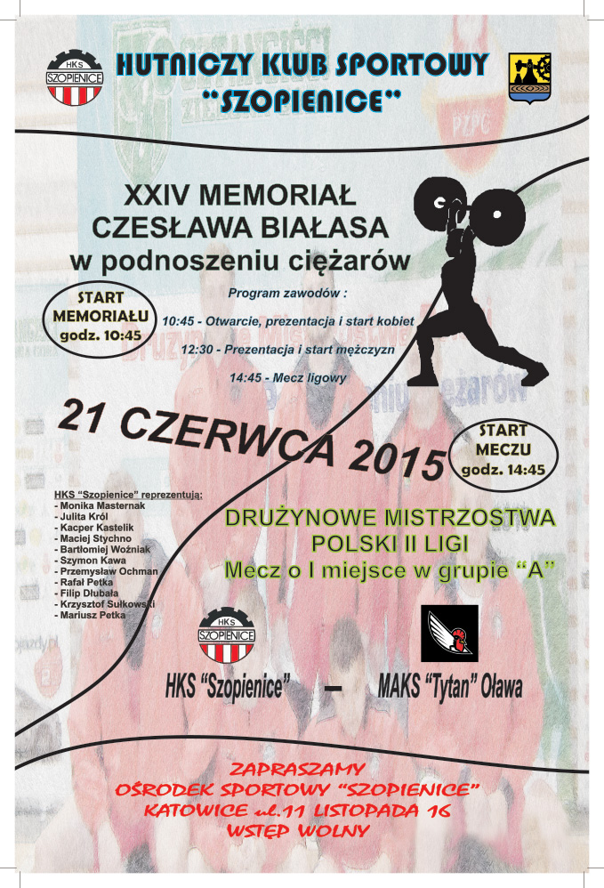 Zapraszamy wszystkich na XXIV Memoriał Czesława Białasa w podnoszeniu ciężarów, który odbędzie się 21 czerwca br. w OS Szopienice, ul. 11 Listopada 16. Start memoriału godz. 10:45.