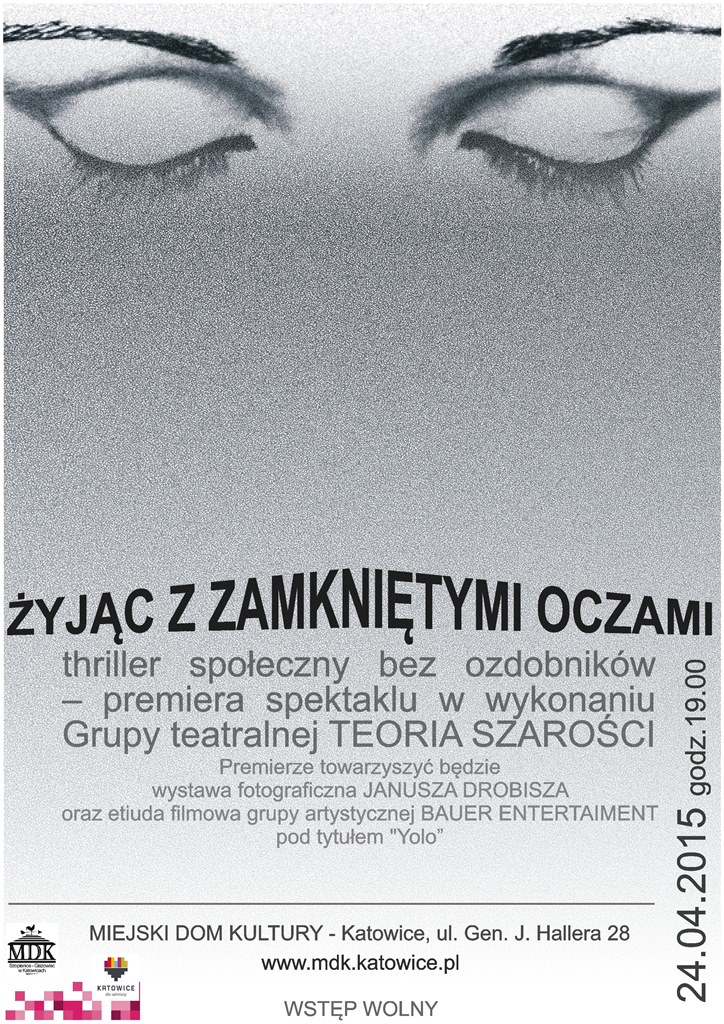 Miejski Dom Kultury w Burowcu oraz Grupa teatralna „Teoria szarości” zaprasza na premierę spektaklu „Żyjąc z zamkniętymi oczami” – thriller społeczny bez ozdobników. Premiera odbędzie się 24 kwietnia 2015 roku o godz.19.00. Premierze towarzyszyć będzie wystawa fotograficzna JANUSZA DROBISZA oraz etiuda filmowa grupy artystycznej BAUER ENTERTAIMENT pod tytułem „Yolo”. Fabuła opowiada o kilku tygodniach z…